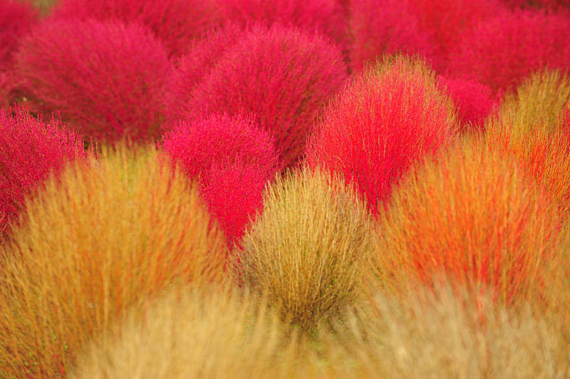 Autumn landscape at Kochia Hill, part of Hitachi Seaside Park in Hitachinaka city, in Ibaraki Prefecture, Japan. These fluffy hill creates a peculiar yet attractive view in autumn when the branches and stems turn bright red.